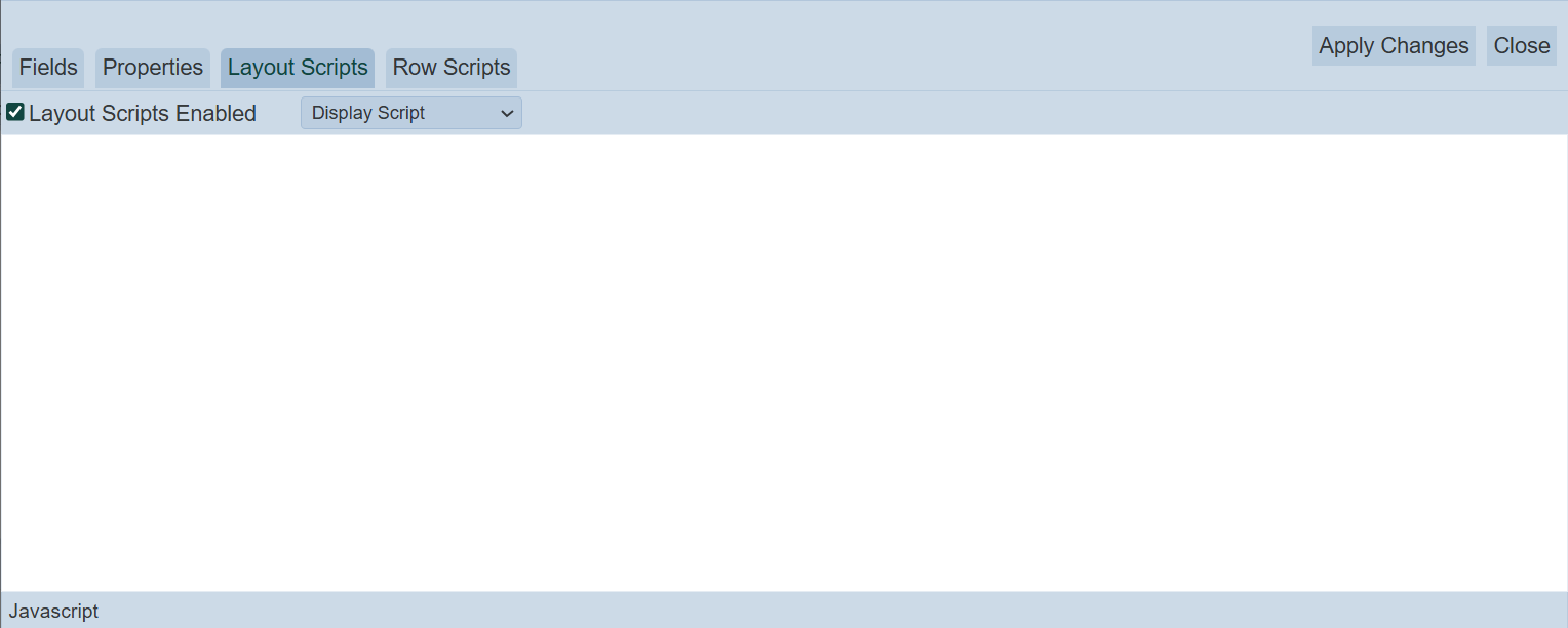 The Layout Scripts tab consists of three portions. The upper portion (grey) consists of the “Layout Scripts Enabled” field and a drop-down list. The “Layout Scripts Enabled” field is selected by default, which enable any scripts in this tab. The drop-own list consists of three options: