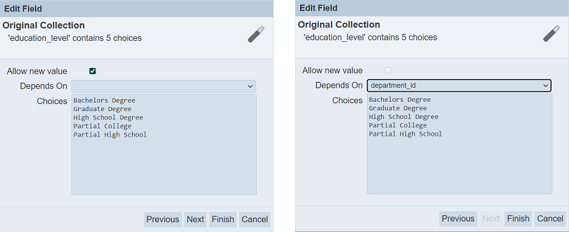 - Depends on a selected field from the schema, thus limiting the input values of another field