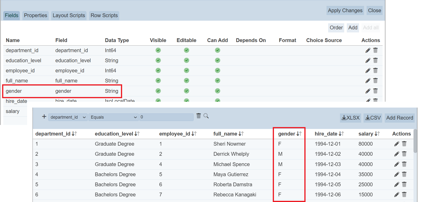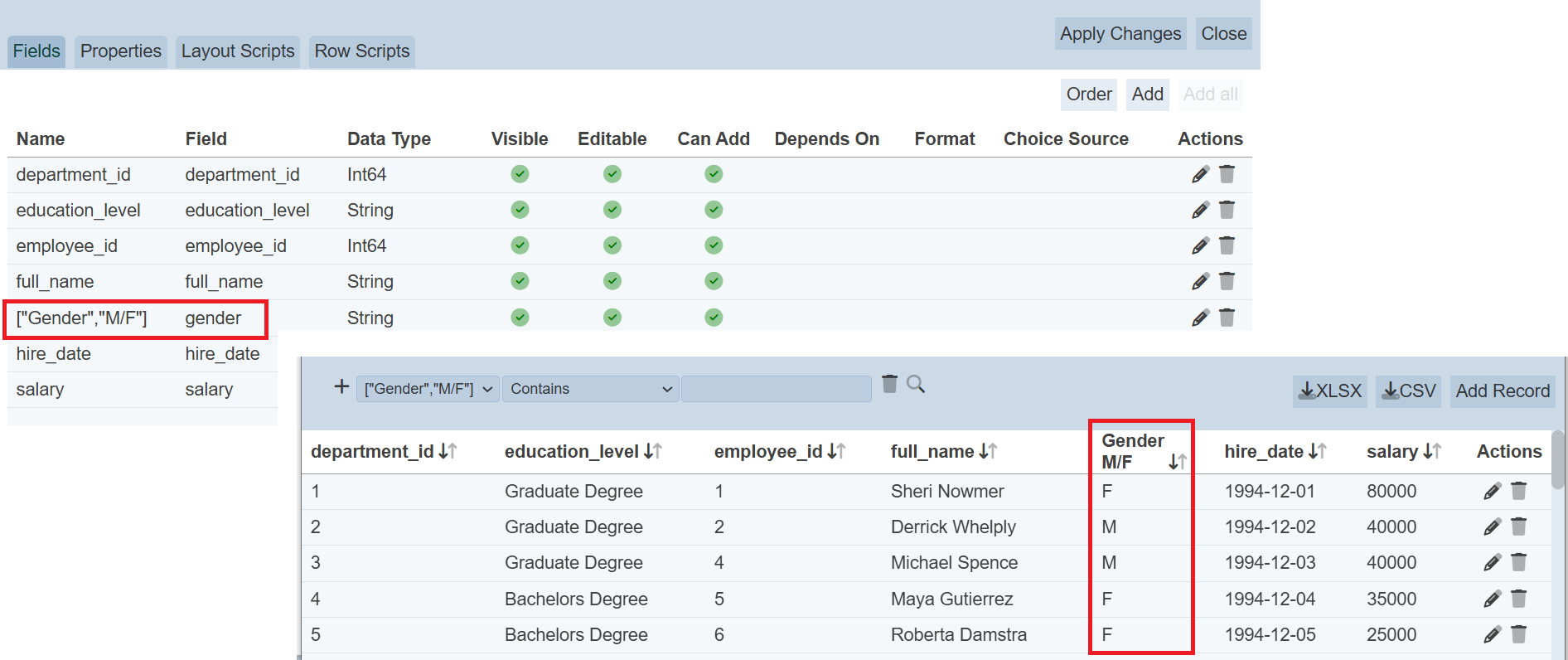 Save the change. In the Editor page, the “gender” column is now displayed in two lines, Gender on the first line and M/F on the second line.