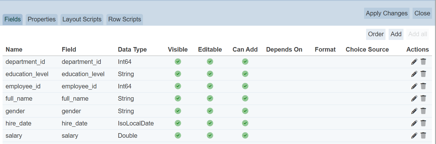 By default, the newly added record editor is enabled and is allowed to add and delete records. No fields from the dataset is added to be editable.