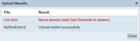 If the name of the record editor to be uploaded already exist, an error message will appear.