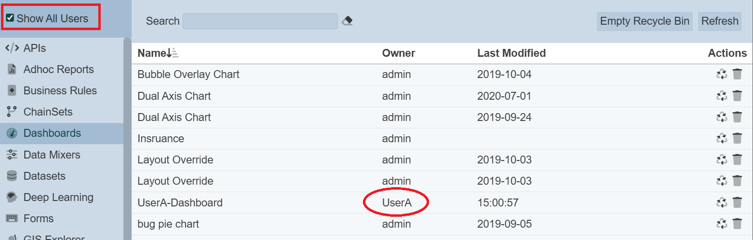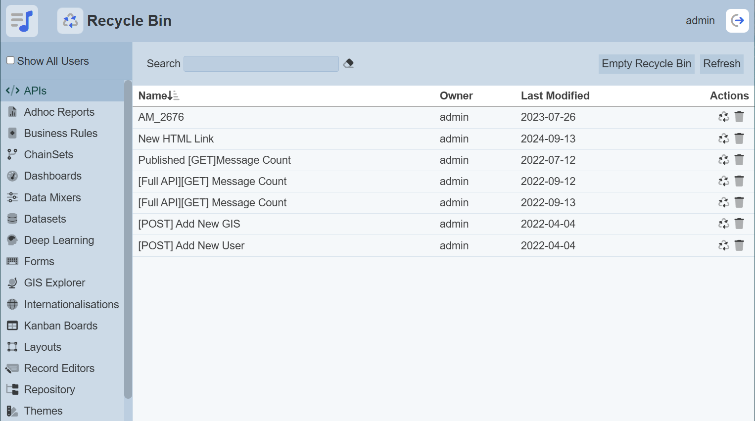 If a user does not have the privilege to access that module, the user will not be able to see the tab of that module in the Recycle Bin management page. For example, if a user has privileges to ETL, dashboard and visualisation modules, he or she will not see the Deep Learning tab in Recycle Bin management page.