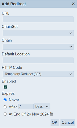 | Expires | Defines when the redirect expires. | Y | Radio buttons | One value can be selected. Options are: - Never - After “current period” - At End Of “current date” |