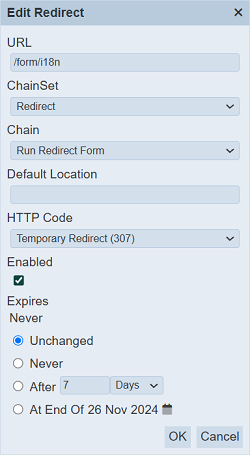 The same fields and constraints in Add Redirect are applied. Noticed that the “Expires” section look a little different from the “Add” panel. There is a new option “Unchanged”, which is selected and a value is displayed above these options. The value indicates the current expiry status of the redirect.