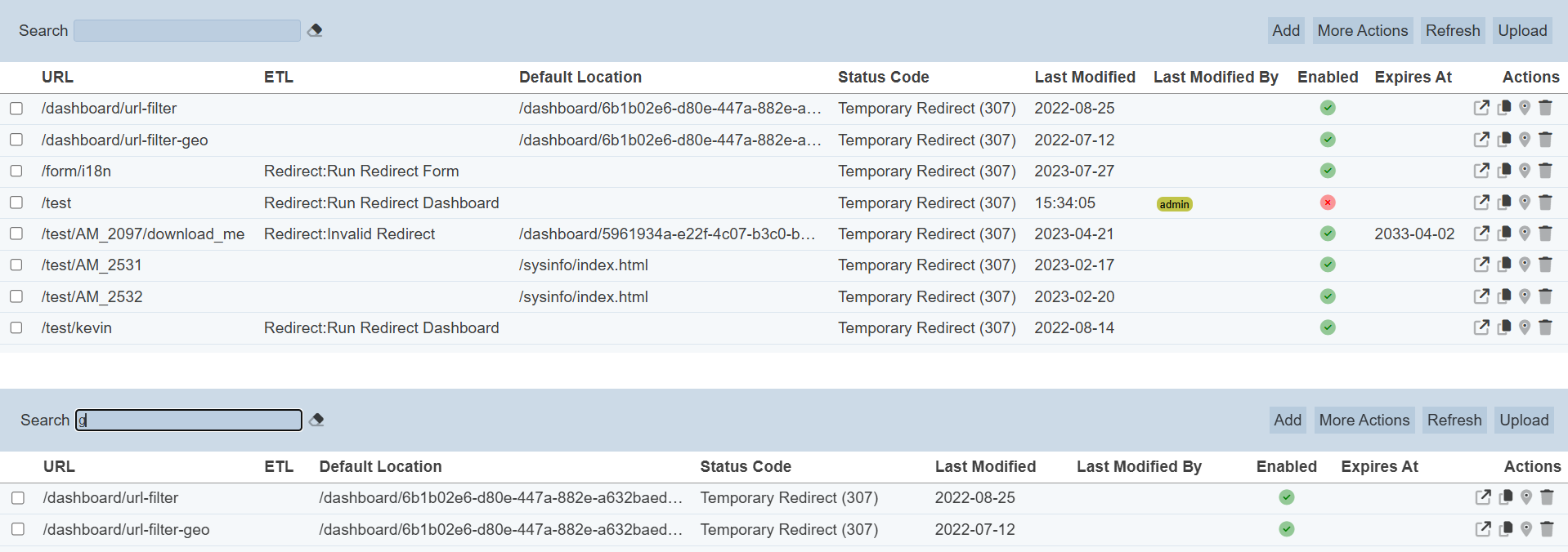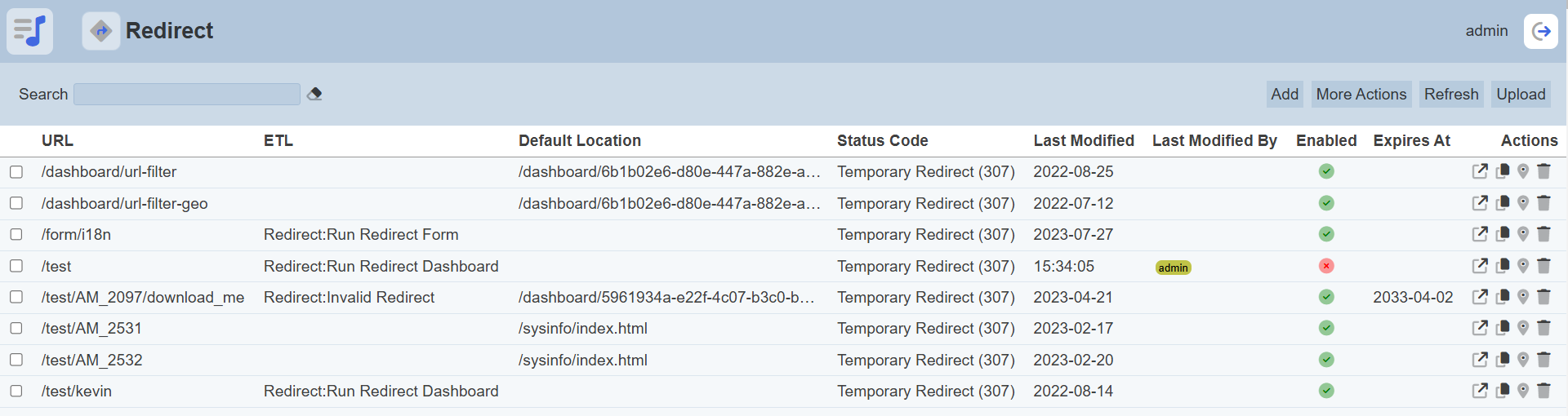 To enable or disable the redirects, click on the “More Actions” button and select the “Set Enabled True” or “Set Enabled False” option respectively.