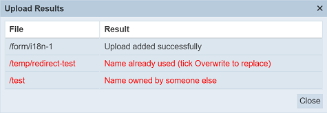 Browse to the location of the zip file to be uploaded. The URL of the redirect will be extracted from the zip file. Click on the “OK” button to upload the redirects. The “Upload Results” dialog box will display the results of the uploading.
