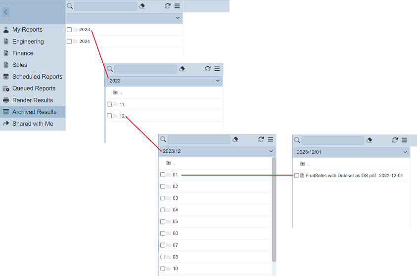To find the archived report, click on the desired year folder to display the months folders. Click on the desired month folder, then the day folder to finally find the archived report.