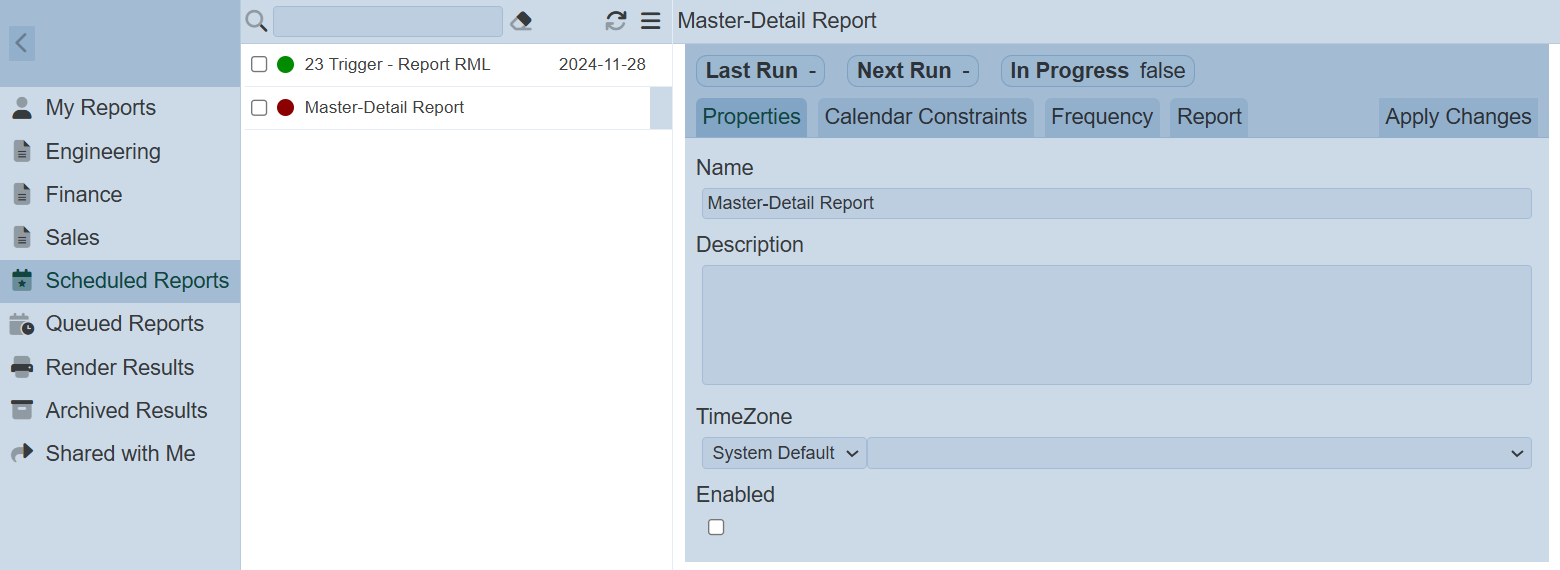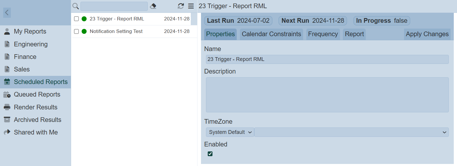 When a report is selected, the render engine will appear in the right panel. A “Trigger” icon will appear on the right of the selected report.