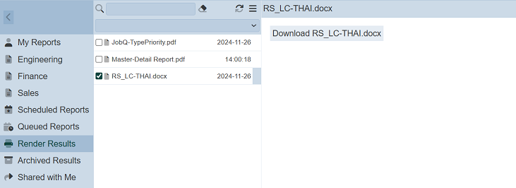 The Render Results option when selected, displays the list of reports rendered (i.e., completed).