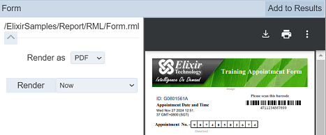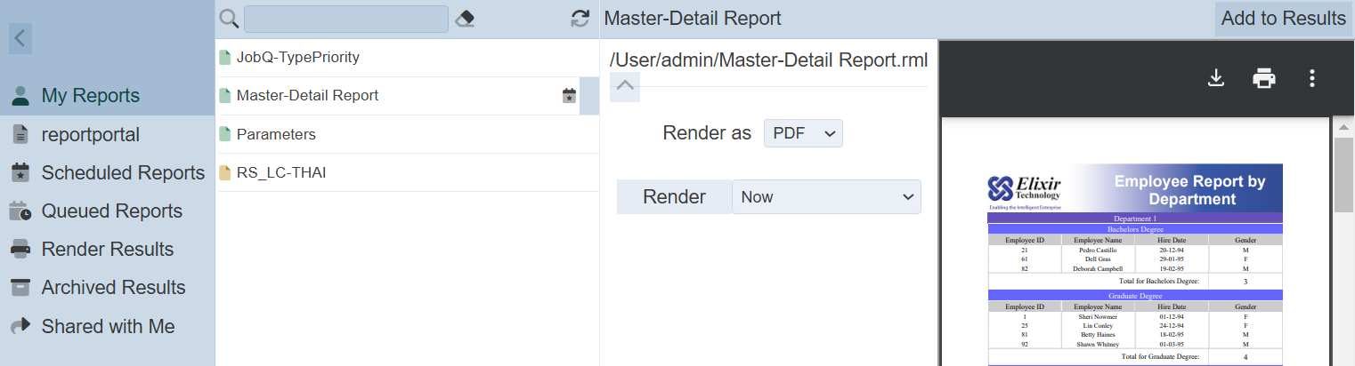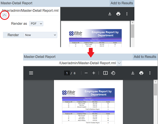After the report is rendered, the “Add to Results” button will appear at the upper right corner of the right panel. This allows you to add the report onto the Render Results list.