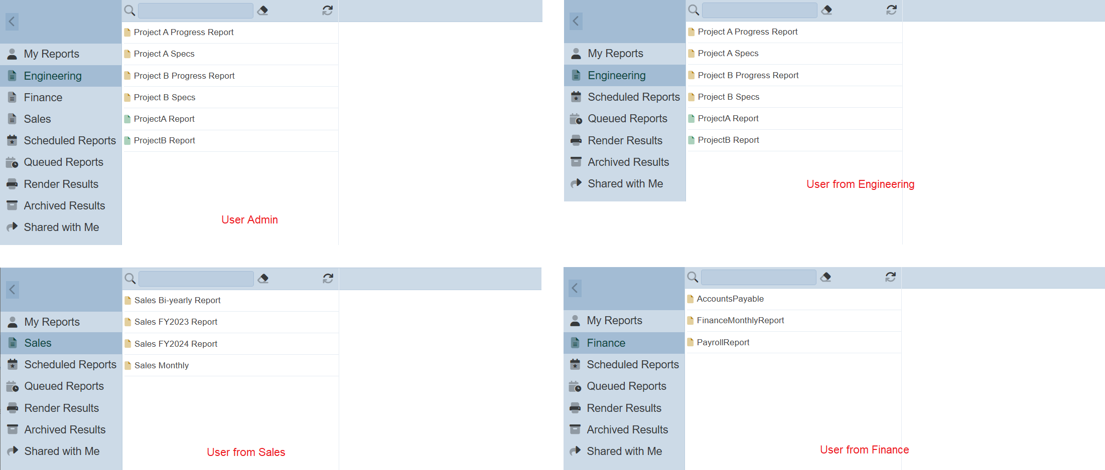User, such as administrator who is given all the roles, will be able to see all options in the Report Portal. A user from the Sales Department (who has the Sales role) may only see the “Sales” option and a user from the Finance Department may only see the “Finance” option.