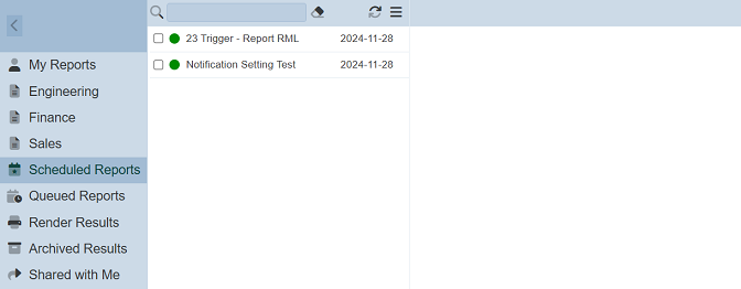 The centre panel displays the list of rendered reports. Scheduled reports (yet to be rendered) will not be included here.