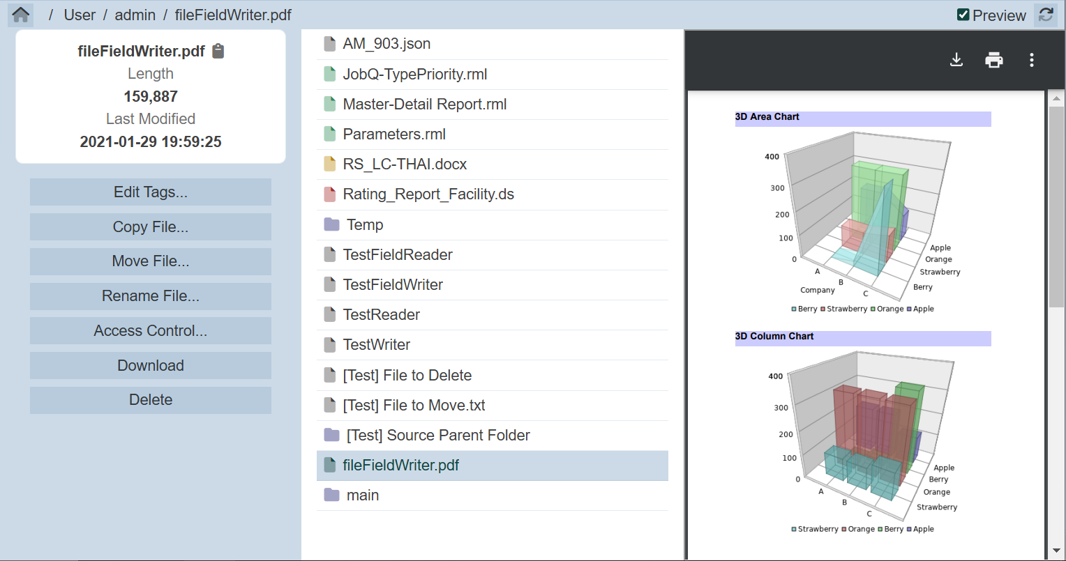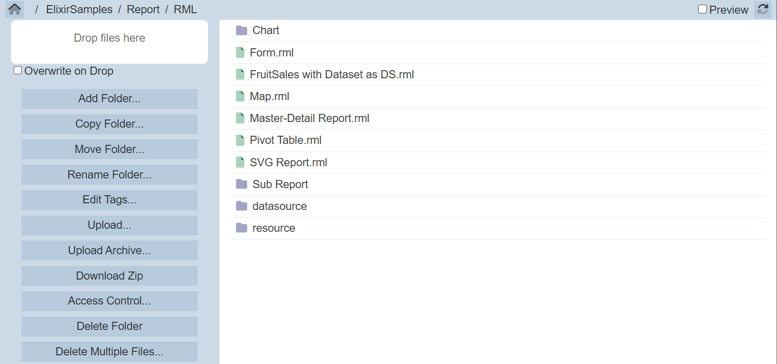 The “Preview” checkbox at the upper right corner of the page, when selected, allows you to view the selected file if the browser supports the format.