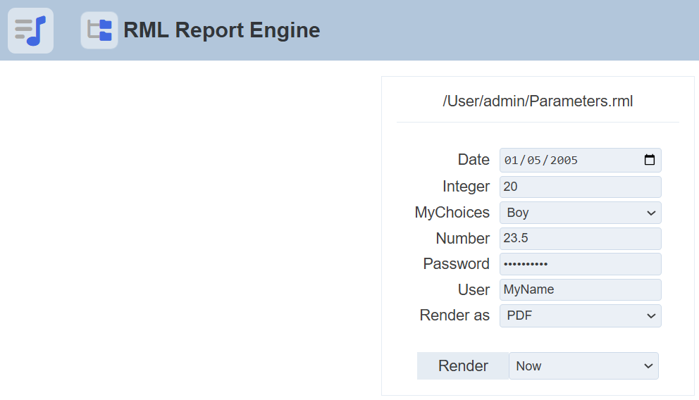 The RML Report Engine uses the DS file as data source and a RML file as template. The file with RML extension file contains annotations, markers and other information (such as location of the DS file) stored in XML format.