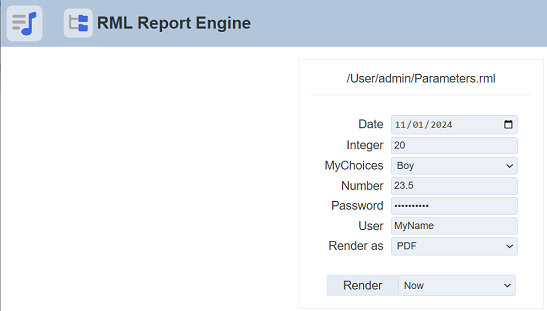 Select the desired format (PDF or XLSX) from the drop-down list and click on the “Render” button. The report is generated using the DS file as content and the RML file as template. If the browser permits, the report is displayed in another tab.