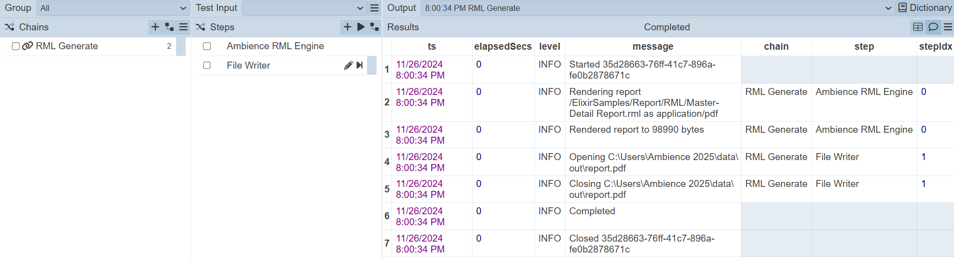 In the simple example below, the ETL chainset generates the RML report and writes to a PDF.