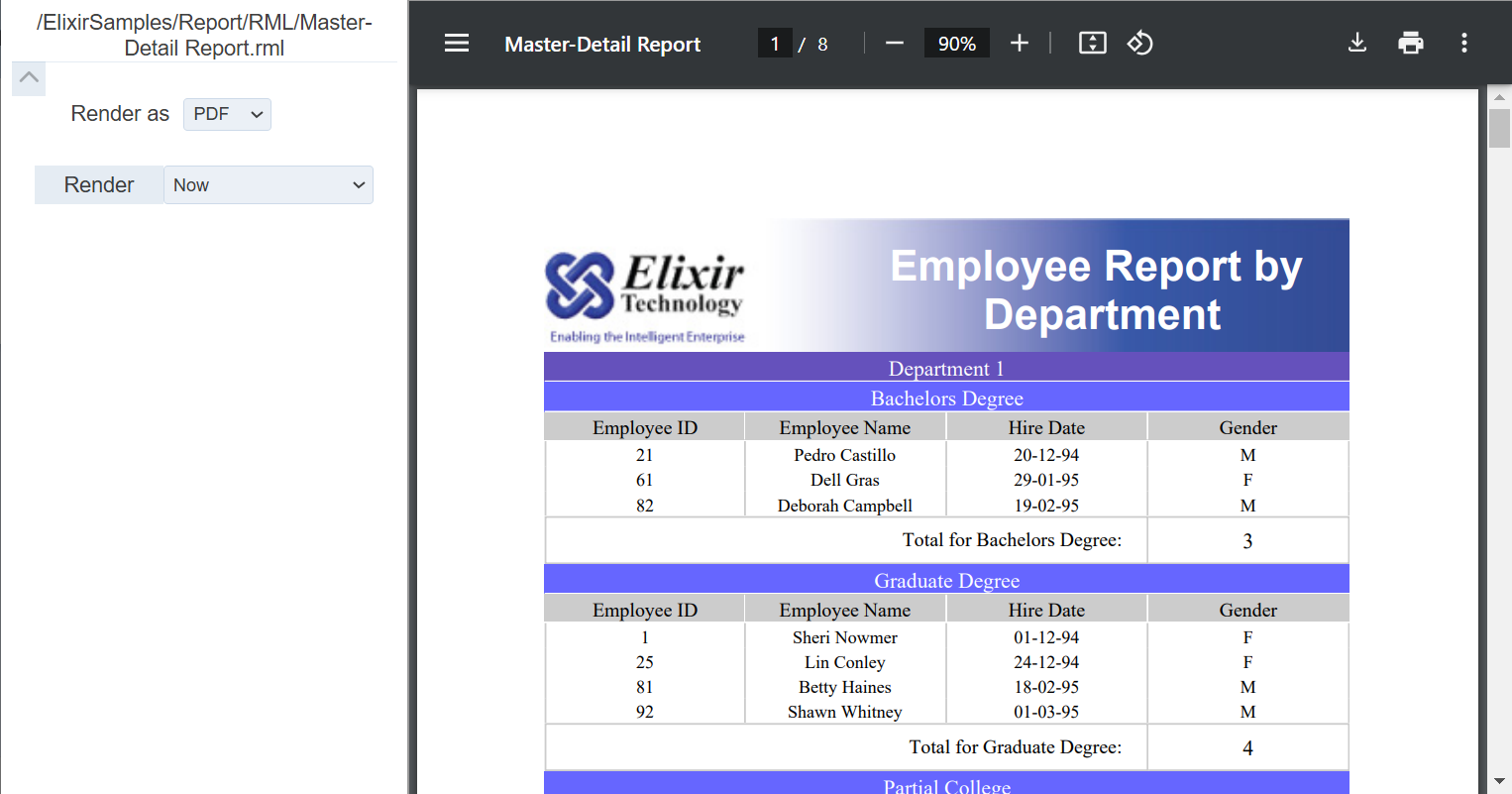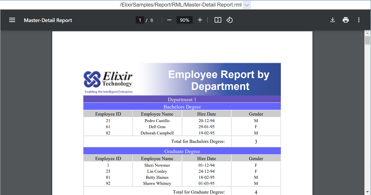 The result PDF will be displayed with the content of Master-Detail Report.rml.