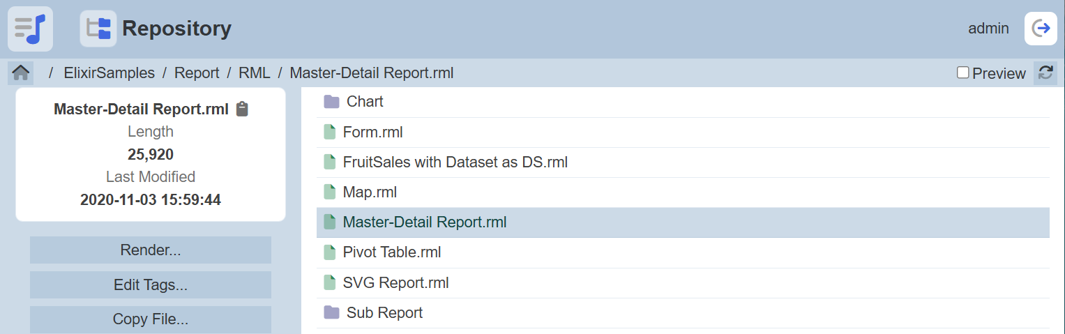To generate the RML report through the Repository module, select the RML document and click the “Render” button.
