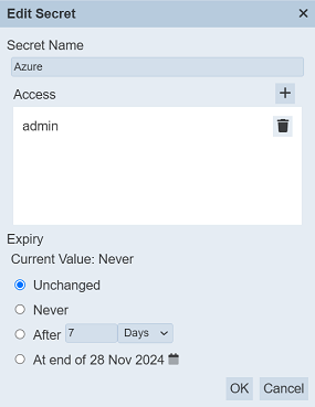 | After | The secret will expire this period. There are two sub-fields. The first field defines the duration and the second field defines the unit (either Days or Hours). |