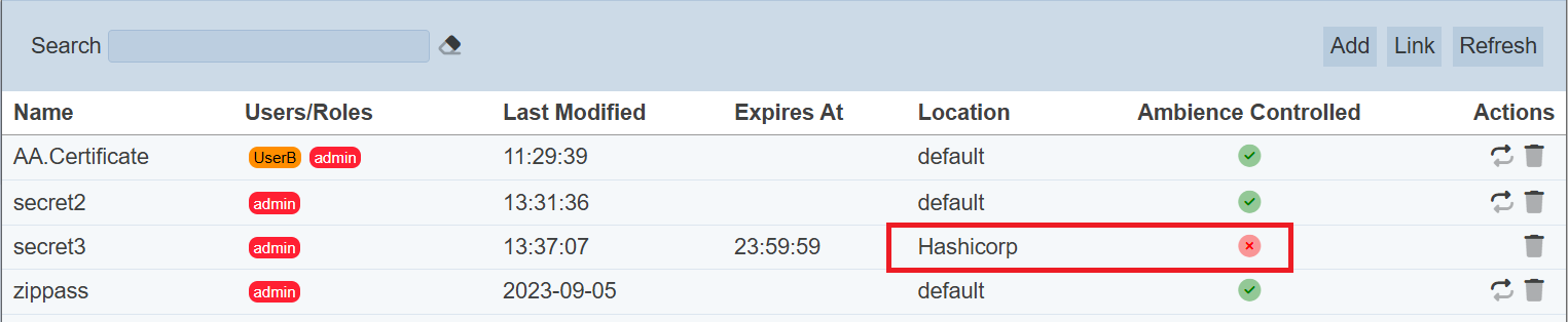 Refer to the relevant sections for more information on the part by clicking the links above. Once the link secret is created, the secret will appear in the management page with a red cross in the “Ambience Controlled” column.