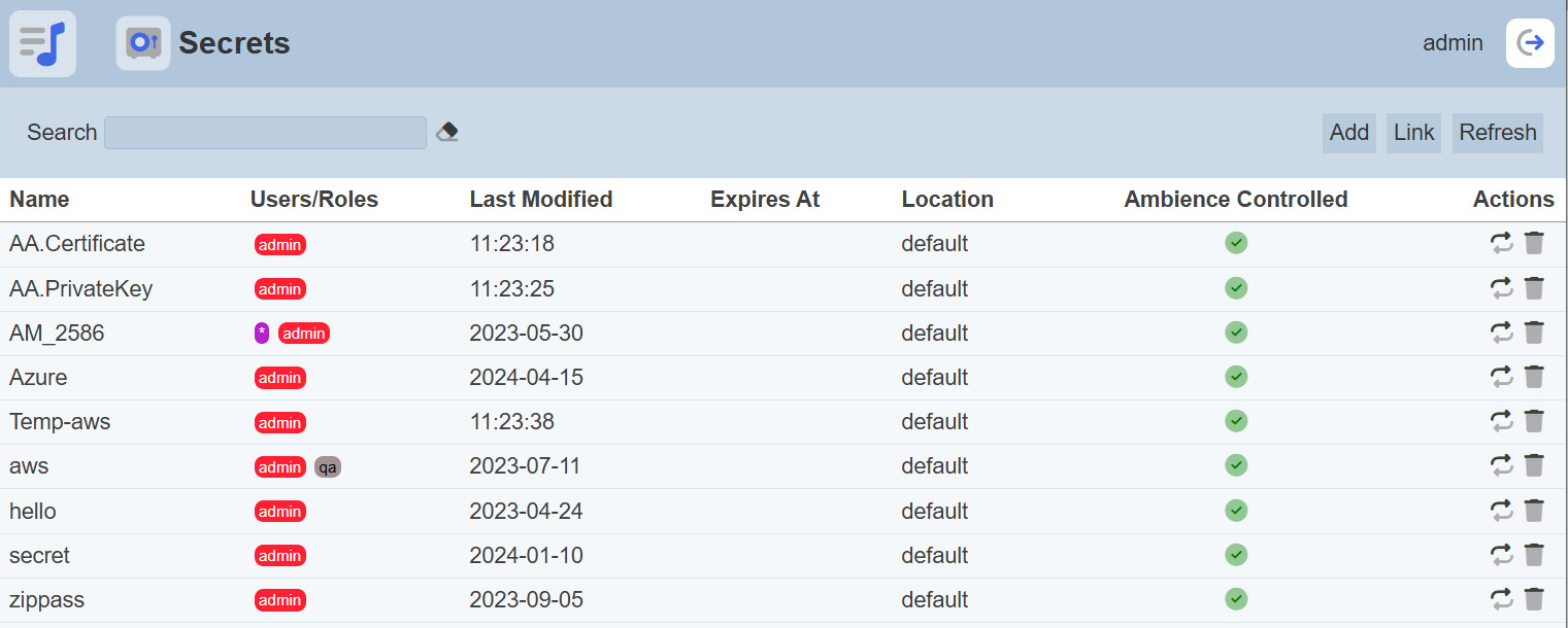 After performing actions on the browser, the list is reloaded to display the list of secrets. The manual “Refresh” button is available and is particularly useful if there are others making changes on the same page.