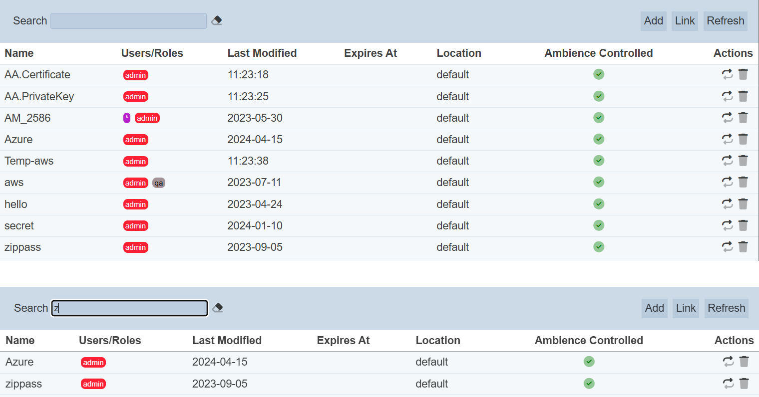 This provides an easy way to search through the list of secrets. It is case-insensitive and displays secrets that have the entered search value in any of the values of the fields below: