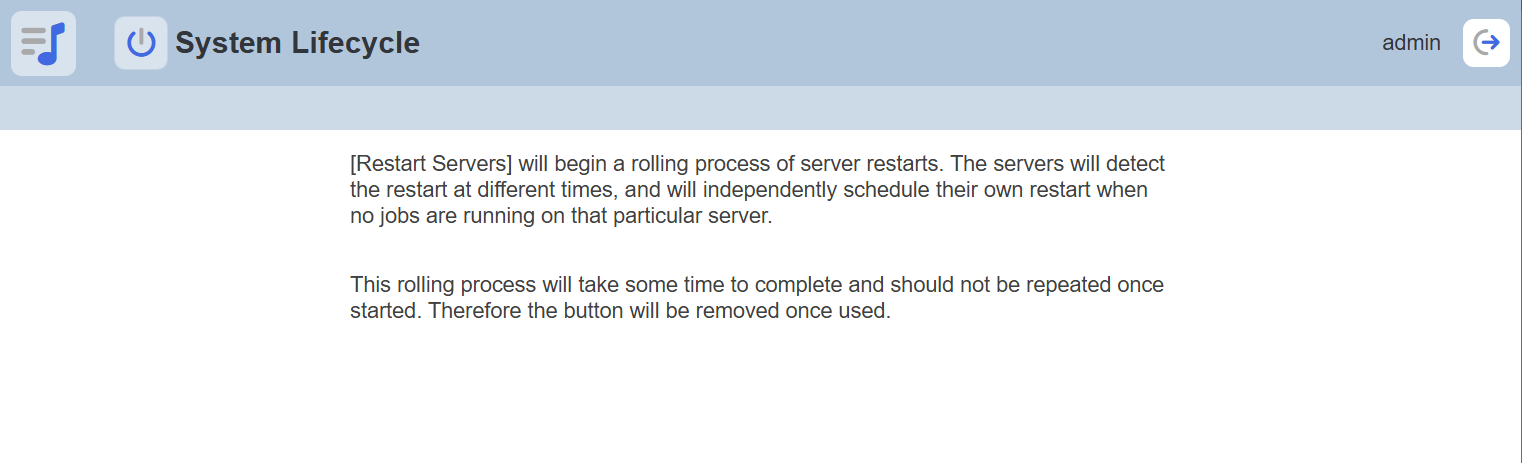 The module has a “Restart Servers” button at the upper right corner of the page. Upon clicking on the button, the System Lifecycle module will schedule a restart of the servers when it is idle. That is, when it is not in the middle of rendering a report for example. Different servers in a cluster will detect the restart at different times and will schedule their own restart.