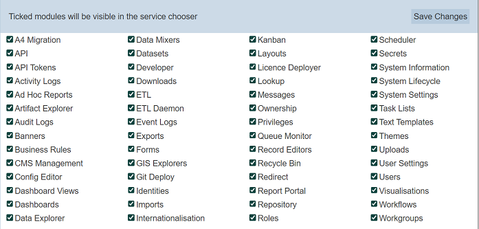 Do note that this change applies to all users and the unselected modules are only hidden in the Service Chooser page. If the URL of the module is known, any user with the appropriate privilege will still be able to access the module.