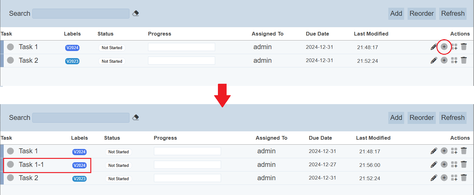 “Add Next Task” icon under the “Actions” column of task “Task 1”, adds the new task “Mod 1-1” in between.