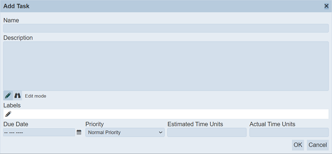 The fields are the same as “Add Task”. Edit as desired. Click on the “OK” button to the changes. Click on the “Cancel” button to abort the action.