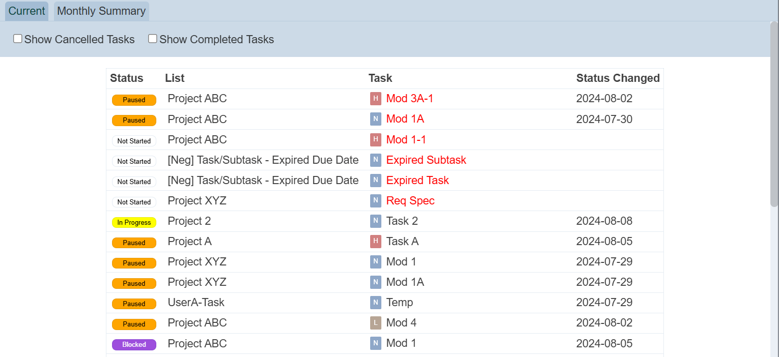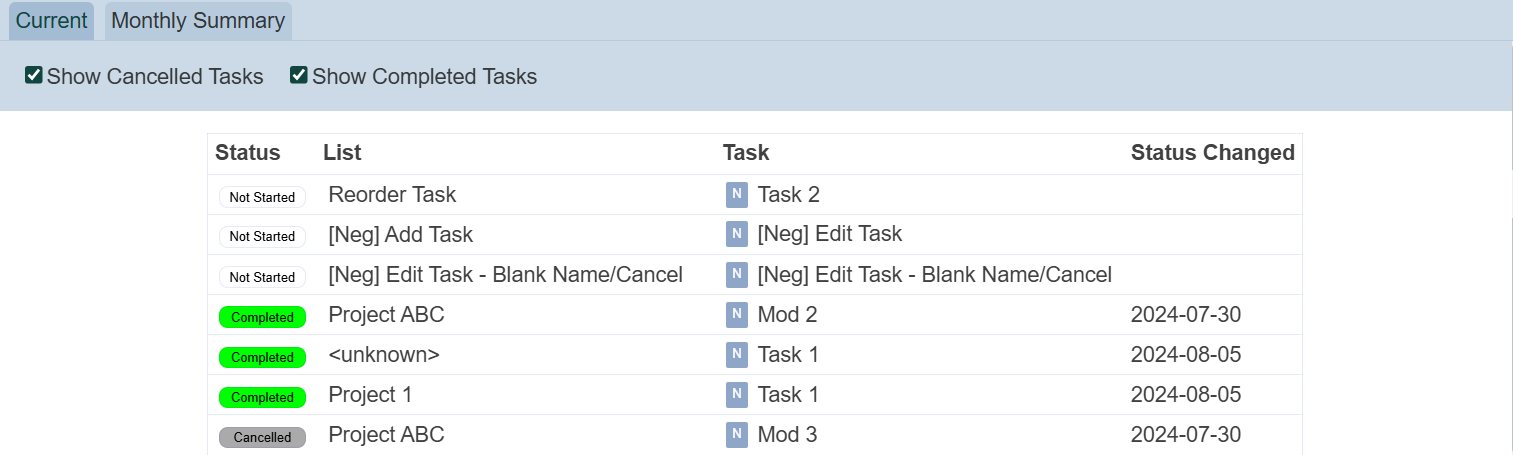 This tab shows all current tasks, except completed and cancelled tasks. To view cancelled or completed tasks, select hte checkboxes next to the “Show Cancelled Tasks” and “Show Completed Tasks” fields respectively.