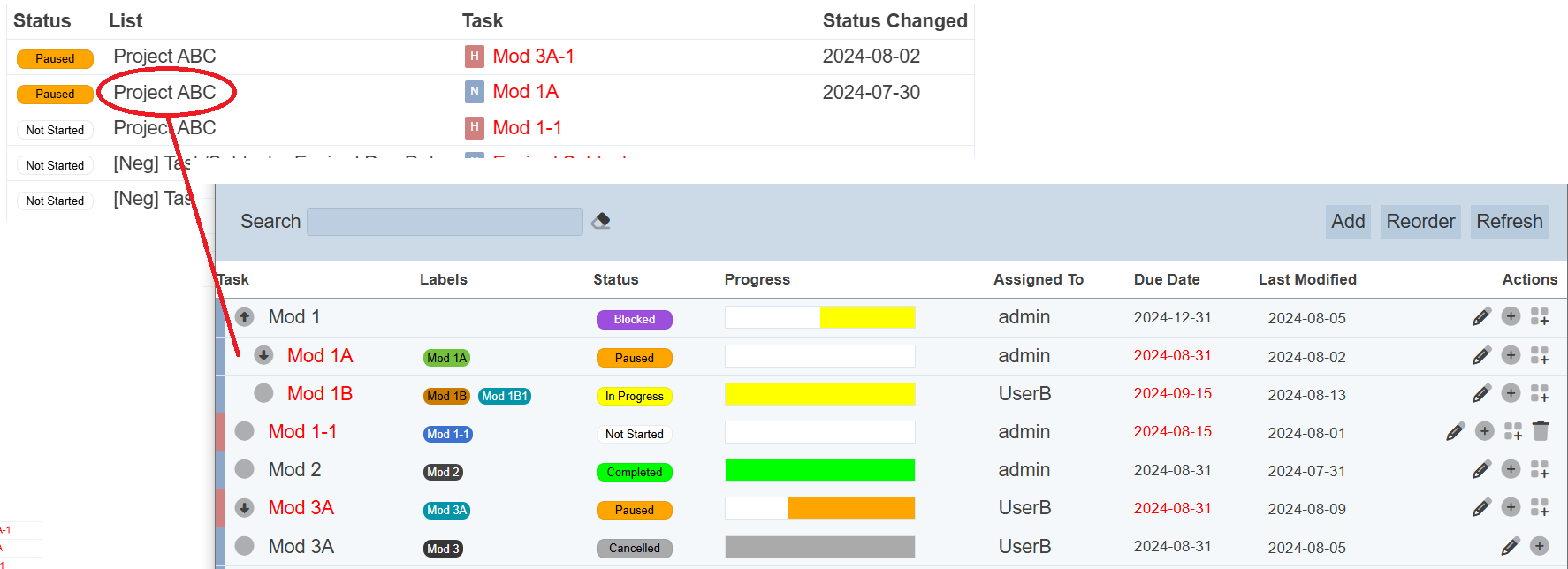 Do note that the items under the “List” and “Task” columns are clickable. For example, when the “Mod 2” under the “Task” column is clicked, the Task Editor page will appear with the details of “Mod 2” task. Refer to Project Editor and Task Editor for more details.