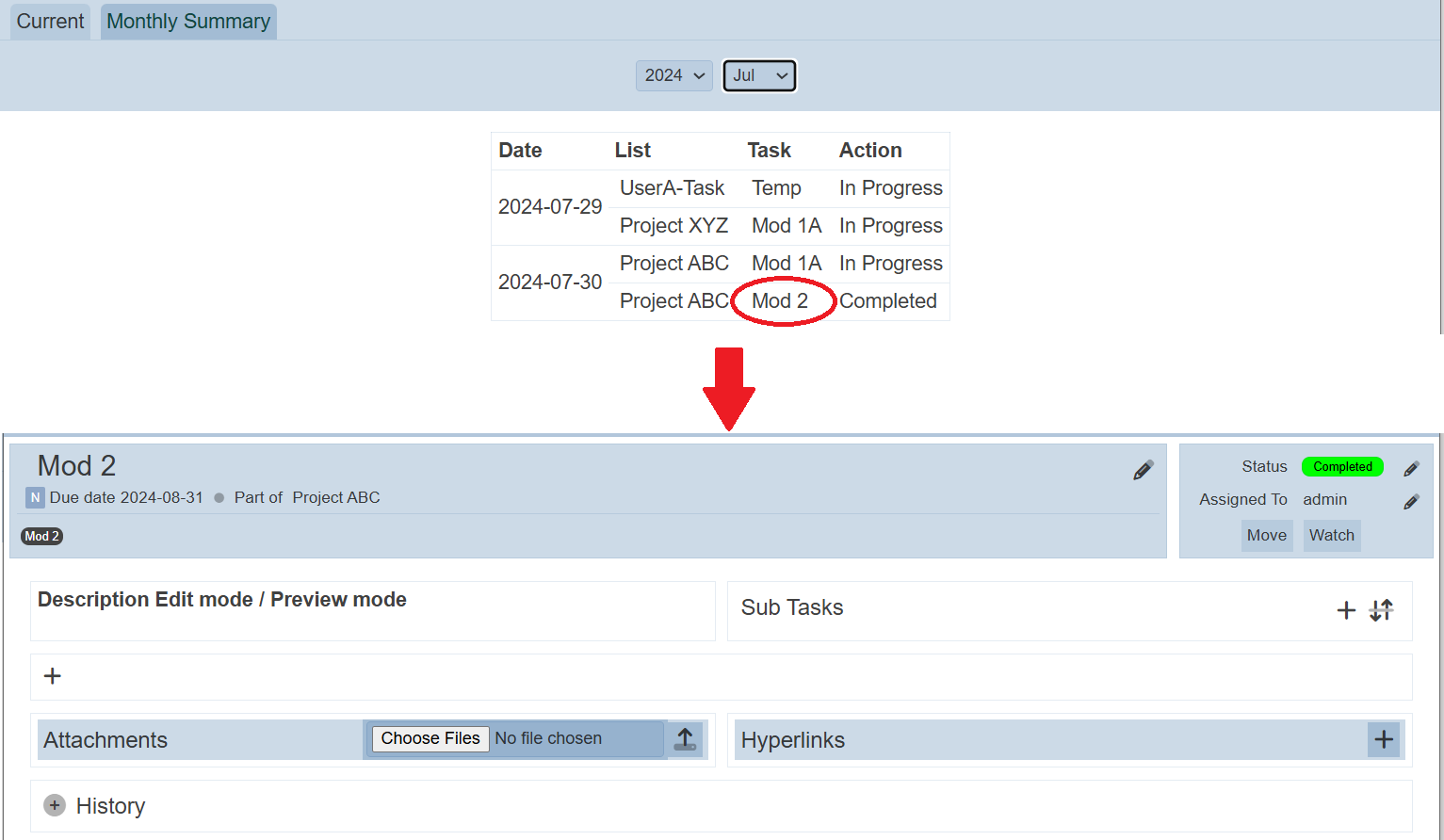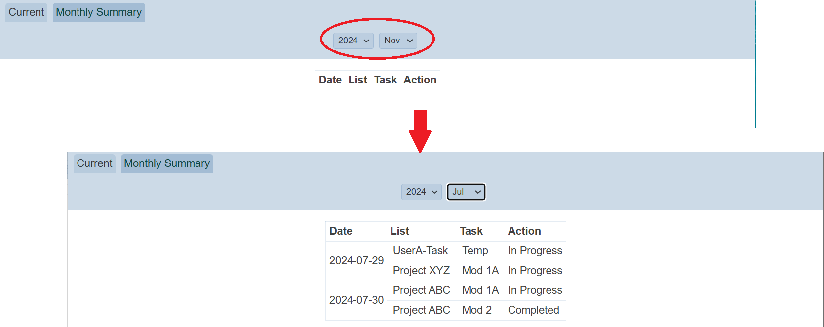 To view the summary for a particular month of a year, select the desired year and month from their respective drop-down list. If there are tasks for the selected year and month, the records will be shown.