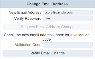 Key in the new email address and the login password in the “Change Email Address” panel. Click on the “Request Email Address Change” button.
