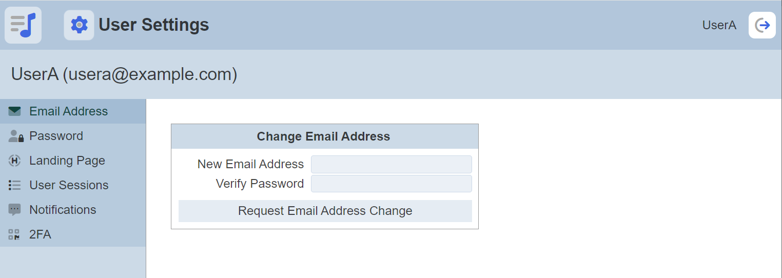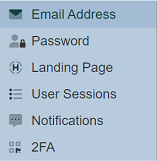 The User Settings module provides a simple interface for users to change their settings (such as email address, password and landing page) and set up 2FA.