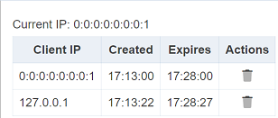 The current IP is shown at the top. The table below shows all the sessions of the user (including current session). The “Client IP” list the IP of the session. The “Created” column denotes the time the session is created. The “Expires” columns denotes the time the session will expires if left untouched (i.e., the session will be terminated).