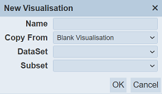 In the “Name” field, key in an unique name for the new visualisation. You can either copy from an existing visualisation from the drop-down list or create a blank visualisation by selecting “Blank Visualisation” in the “Copy From” field. Select a dataset from the drop-down list in the “DataSet” field. In the “Subset” field, select a subset from the drop-down list (optional). Click on the “OK” button to create the new visualisation or click on the “Cancel” button to abort the action.