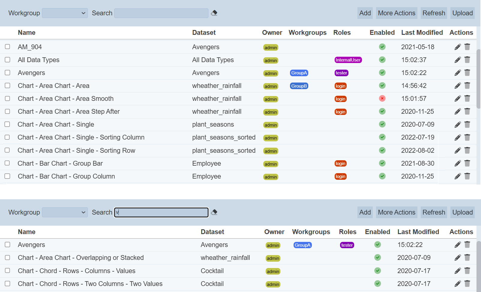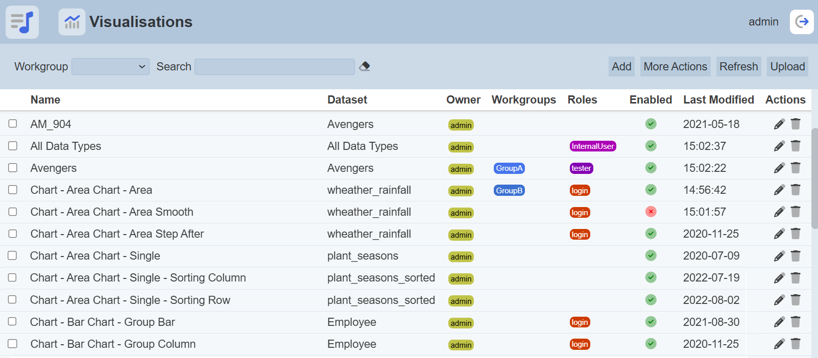 To enable or disable the visualisations, click on the “More Actions” button and select the “Set Enabled True” or “Set Enabled False” option respectively.