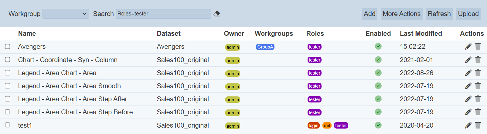 In the example above, visualisations that are assigned the role “tester” are shown.