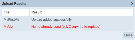 Browse to the location of the zip file to be uploaded. The name of the visualisations will be extracted from the zip file. Click on the “OK” button to upload the visualisations. The “Upload Results” dialog box will display the results of the uploading.