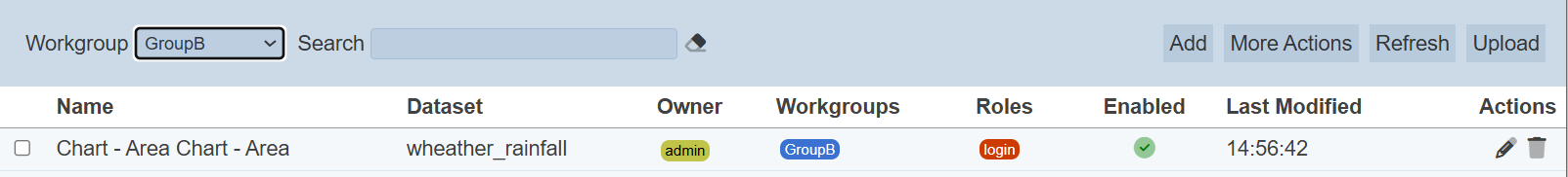 Alternatively, you can click on the any item under the “Dataset”, “Owner”, “Workgroups” and/or “Owner” columns respectively to aid the search for the visualisation in the page.