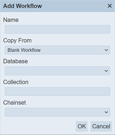 In the “Name” field, key in an unique name for the new workflow. In the “Copy From” field, you can either select “Blank Workflow” to create a blank workflow or copy from an exisitng workflow from the drop-down list. Select the appropriate database, database collection and ETL chainset from their respective drop-down list.