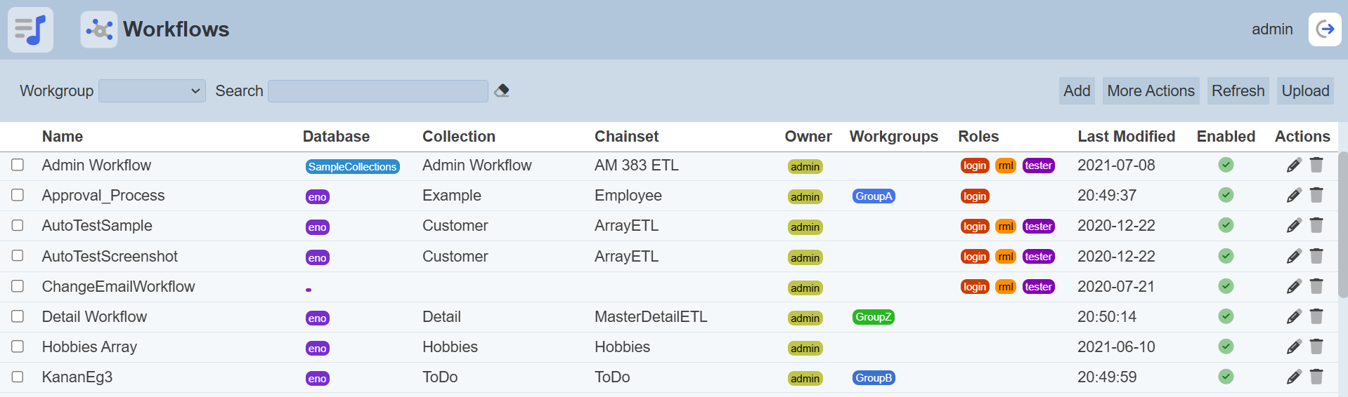 After performing actions on the browser/tab, the list is reloaded to display the list of workflows. The manual “Refresh” button is available and is particularly useful if you have opened multiple pages and are making changes in these pages.