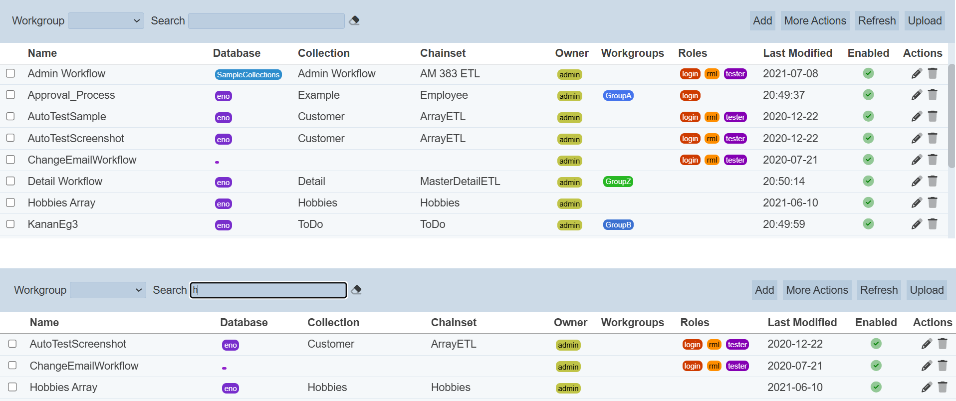 Alternatively, you can click on the any items under the “Database”, “Owner, ”Workgroups“ and/or ”Roles" columns to aid the search for the workflows in the page.