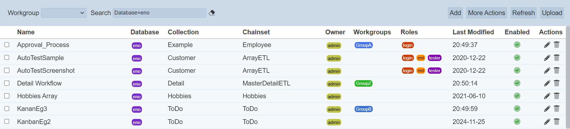 To enable or disable the workflows, click on the “More Actions” button and select the “Set Enabled True” or “Set Enabled False” option respectively.