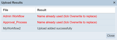 Browse to the location of the zip file to be uploaded. The name of the workflows will be extracted from the zip file. Click on the “OK” button to upload the workflows. The “Upload Results” dialog box will display the results of the uploading.