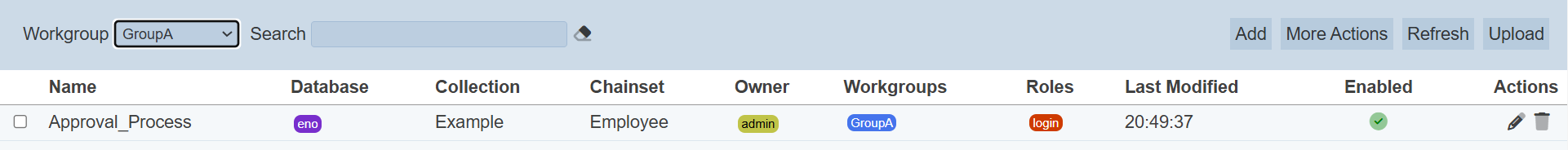 Do note that if an option is selected from the drop-down list for the “Workgroup” field at the top of the page, any workflow added to the management page will have the selected workgroup added to it. For example, if “Workgroup A” is selected, a new workflow “Workflow XYZ” is added. “Workflow XYZ” will have “Workgroup A” added to its properties.