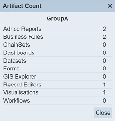 In the example above, workgroup GroupA is associated with one Business Rule, one Dashboard and four Forms.