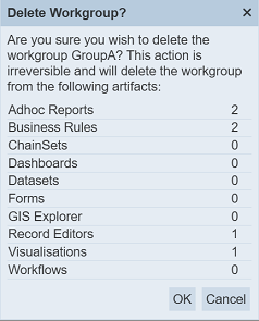 The dialog box will list the artifacts which the workgroup is related to. To confirm deletion, click on the “OK” button. To abort the action, click on the “Cancel” button.