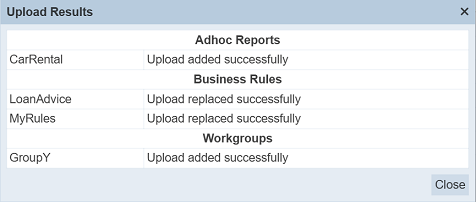 When the zip file is uploaded, it is checked to see if it matches the format of a workgroup. If it does, it takes the artifact lists and the supplierID (or which module it belongs to). It sends the list of its artifacts to the supplierID (or module) which handles the validation and uploading of them. If an artifact exists, if you are the owner and the overwrite is selected, the upload will resolve, otherwise it will not (i.e., it will fail)